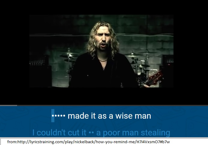 Poniżej przykład z piosenki Nickelback 'How you remind me' W pola oznaczone kropami musimy wpisać w odpowiednim czasie poprawne wyrazy/wyraz. Gra kończy się jeśli zabraknie nam czasu lub piosenka dobiegnie końca.